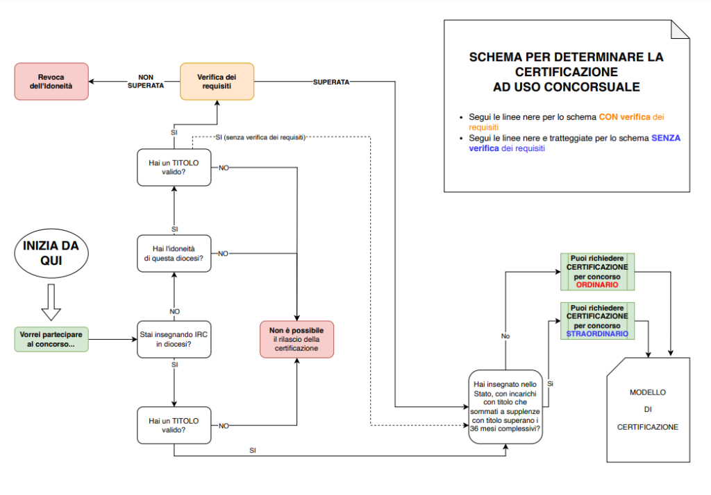 Schema per determinare la certificazione ad uso concorsuale Pubblicato il Gennaio 29, 2024 - Notizie Ecco uno schema semplice e intuitivo per verificare se si possiedono i requisiti necessari per ottenere la certificazione ad uso concorsuale, consentendo così di partecipare ai prossimi concorsi IRC.