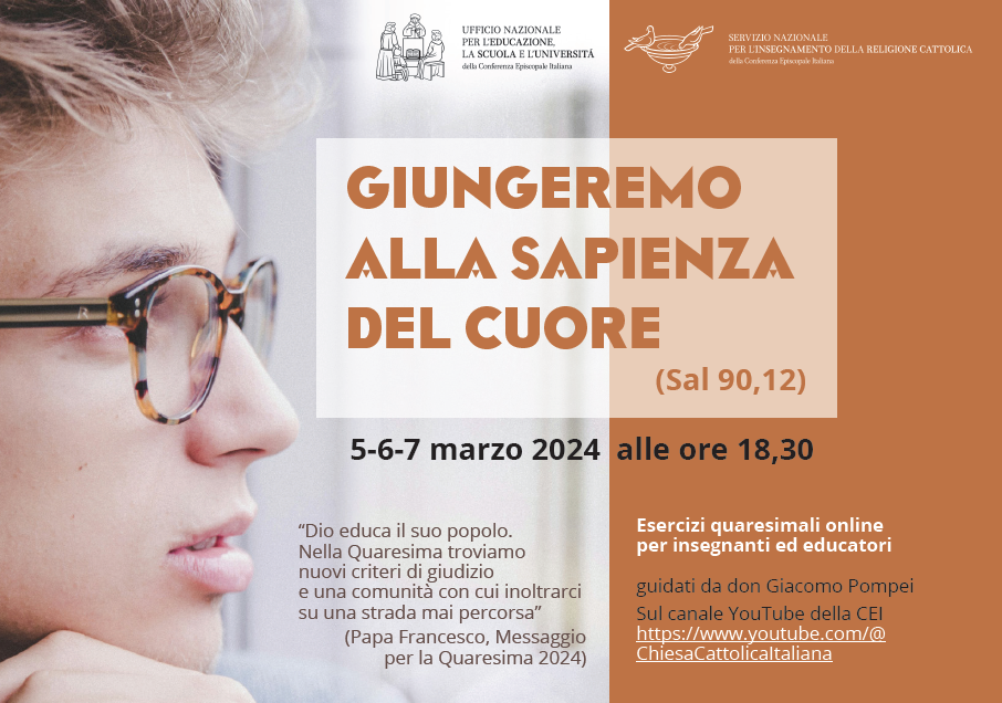 Il Servizio Nazionale per l’Insegnamento della Religione Cattolica e l’Ufficio Nazionale per l’Educazione, la Scuola e l’Università propongono una tre giorni di esercizi spirituali quaresimali online per insegnanti ed educatori dal tema “Giungeremo alla sapienza del cuore”. Gli incontri, guidati da don Giacomo Pompei, si terranno il 5-6-7 marzo alle ore 18:30 in streaming, sul canale YouTube della CEI: https://www.youtube.com/@ChiesaCattolicaItaliana. Ogni meditazione avrà la durata di circa mezz’ora e conterrà alcuni spunti per proseguire personalmente.