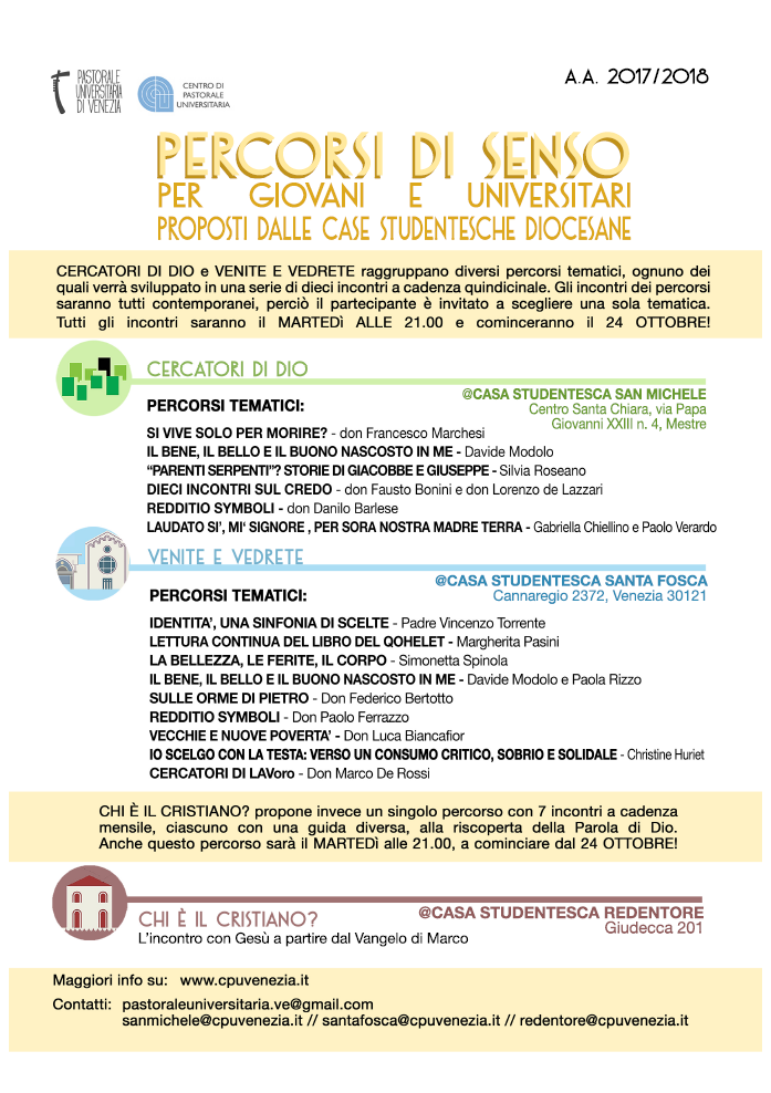 Per San Michele (Mestre) e Santa Fosca (Cannaregio) gli incontri si terranno il martedì ore 21.00 a partire dal 24 ottobre, ogni due settimane, direttamente nelle case studentesche, e sarà possibile scegliere un gruppo di approfondimento all’interno della vasta rosa proposta.