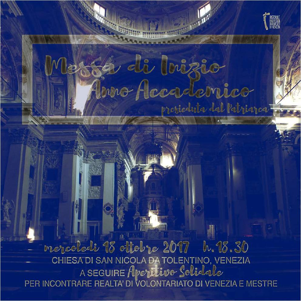 Mercoledì 18 ottobre alle 18.30 nella chiesa dei Tolentini la S. Messa di inizio Anno Accademico presieduta dal Patriarca Francesco. Invitati a partecipare tutti gli studenti, i docenti e il personale.