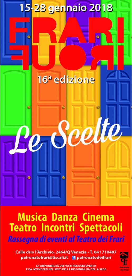 Dal 13 gennaio al 28 gennaio ritorna FrariFuori: giunta alla 16ª edizione, la rassegna di eventi (organizzata dal Patronato dei Frari a Venezia) dallo scorso anno ha un tema unificante i vari eventi: mentre la precedente edizione era tutta orientata ai “sogni”, quest’anno i vari eventi sono collegati dal filo delle “scelte”, ispirati del tema del discernimento del prossimo sinodo sui giovani. L’immagine della copertina spiega la prospettiva: le scelte sono come tante porte di fronte a noi che dobbiamo aprire e attraversare. Oggi, soprattutto per le giovani generazioni è difficile scegliere perché se da una parte sono molte di più le opportunità – e questo è un fattore senz’altro positivo – dall’altro diventa importante trovare dei criteri, e degli aiuti a come scegliere, a che cosa scegliere, perché non tutte le scelte sono uguali. FrariFuori vuole essere uno spazio per riflettere sulla complessità delle scelte e sul discernimento che bisogna operare in vista delle decisioni da prendere.