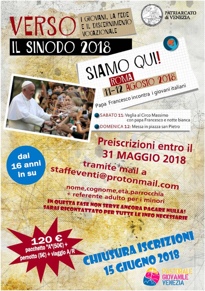 Vi alleghiamo del materiale utile per partecipare a “Siamo qui!”, il grande incontro di Papa Francesco con i giovani a Roma nei giorni 11 e 12 agosto, in preparazione al Sinodo dei giovani. Due giorni intensi di giovane fede!