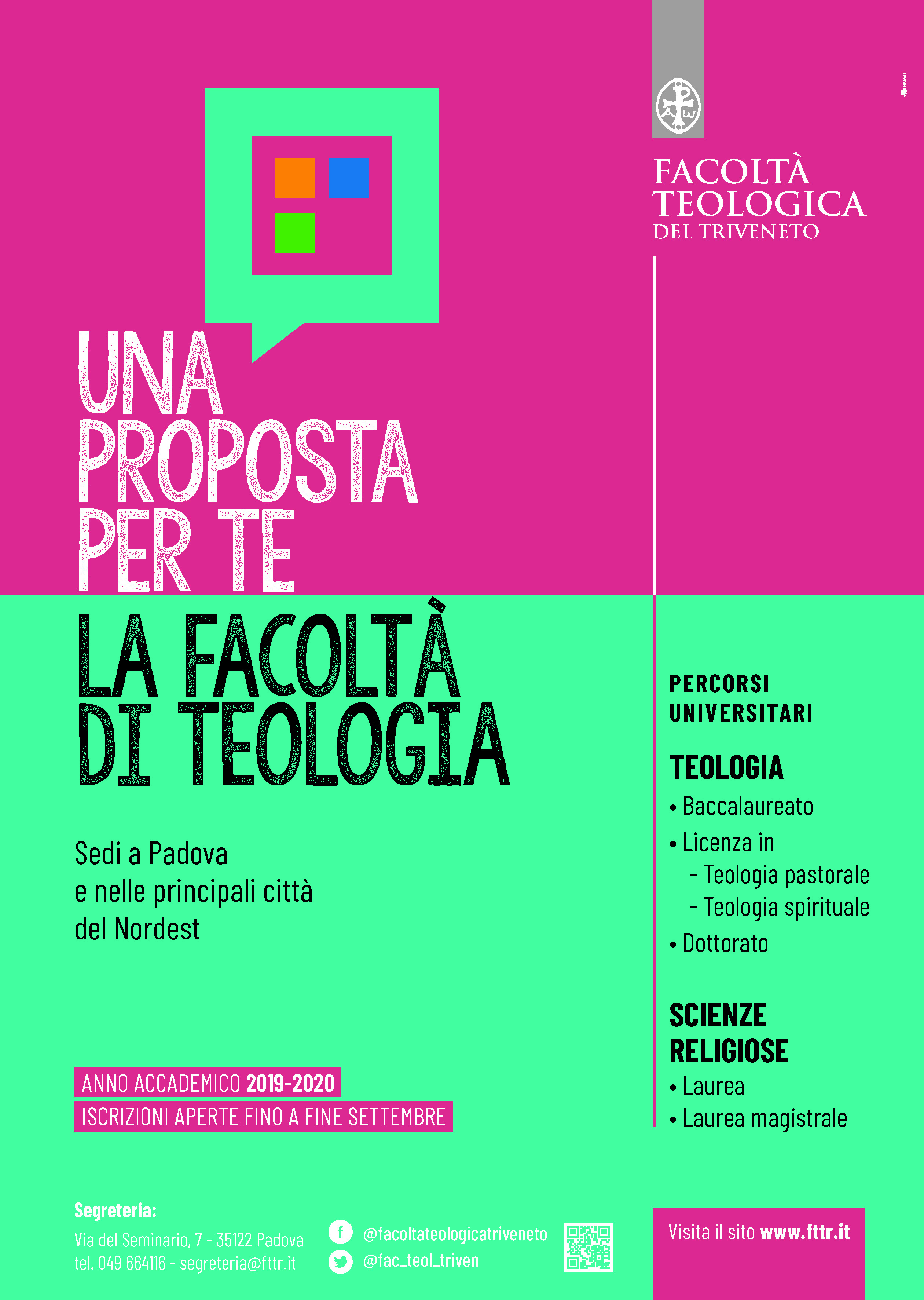 Ulteriori informazioni al link: http://www.fttr.it/aa-20192020-i-percorsi-universitari-di-teologia-e-scienze-religiose-della-fttr/ ) e in allegato i depliant dei diversi cicli di studio: