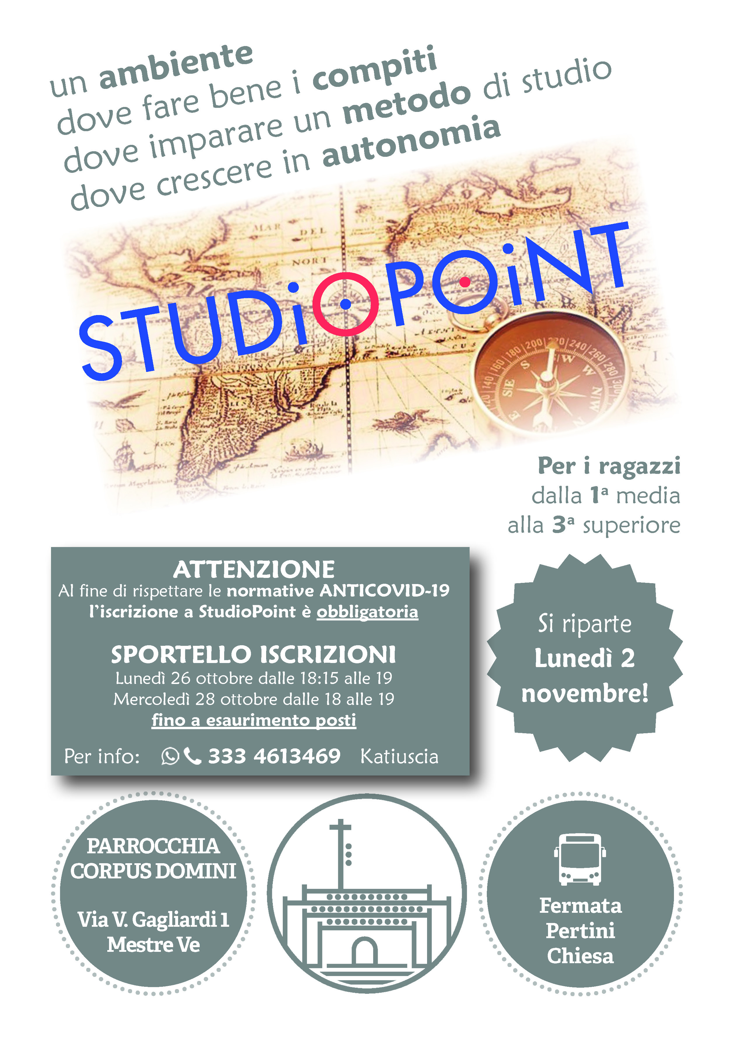 Una bella opportunità per svolgere servizio, sperimentare la gratuità e mettere a frutto i propri talenti a favore di giovanissimi studenti: questo e molto altro è STUDIO POINT, l’attività di sostegno allo studio promossa da Pastorale Giovanile e Pastorale Universitaria, per consentire ai ragazzi delle scuole secondarie di primo grado (le mitiche scuole medie) di restare al passo con lo studio, di affrontare con grinta e più sicurezza compiti, verifiche e interrogazioni.