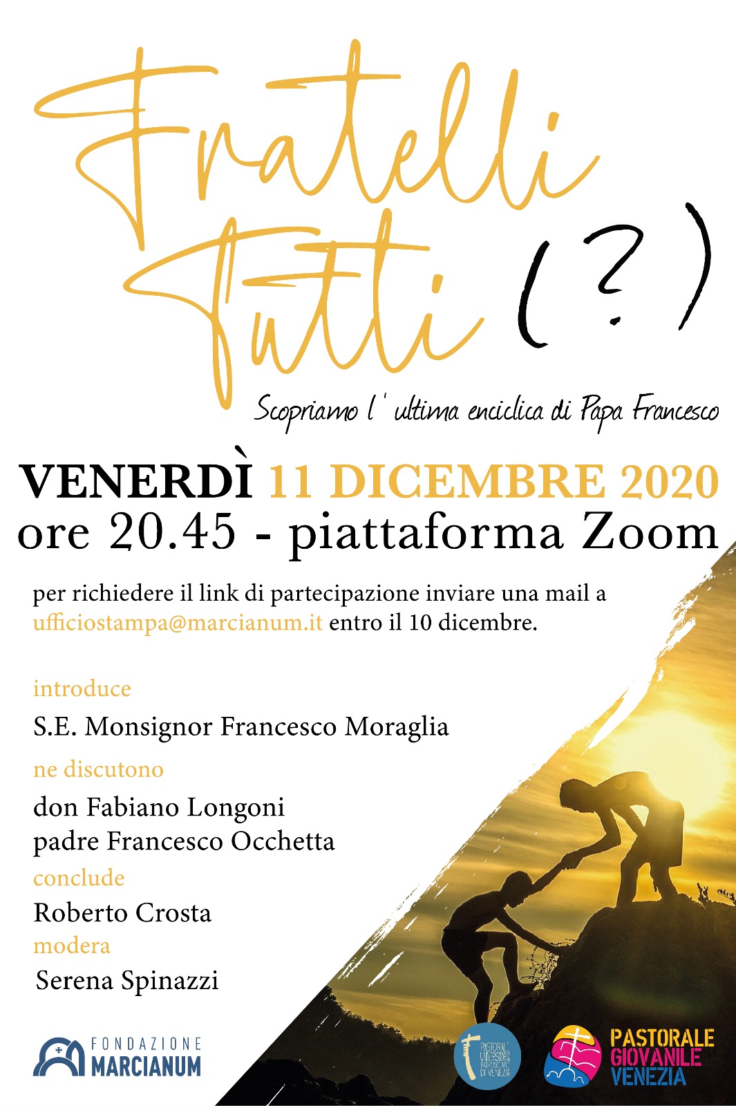 Fratelli tutti Pubblicato il Novembre 27, 2020 - Giovani, News, PGVE Hai letto l’ultima enciclica di Papa Francesco? No?!? Allora scopriamola insieme venerdì 11.12 alle 20:45 su Zoom Richiedi le credenziali per accedere e sfogliare con noi le pagine e il messaggio della “Fratelli tutti”