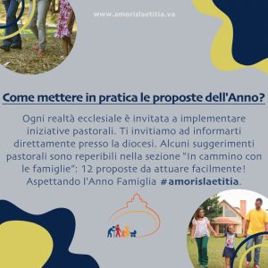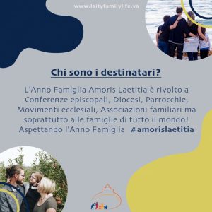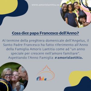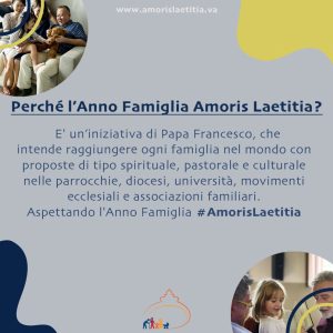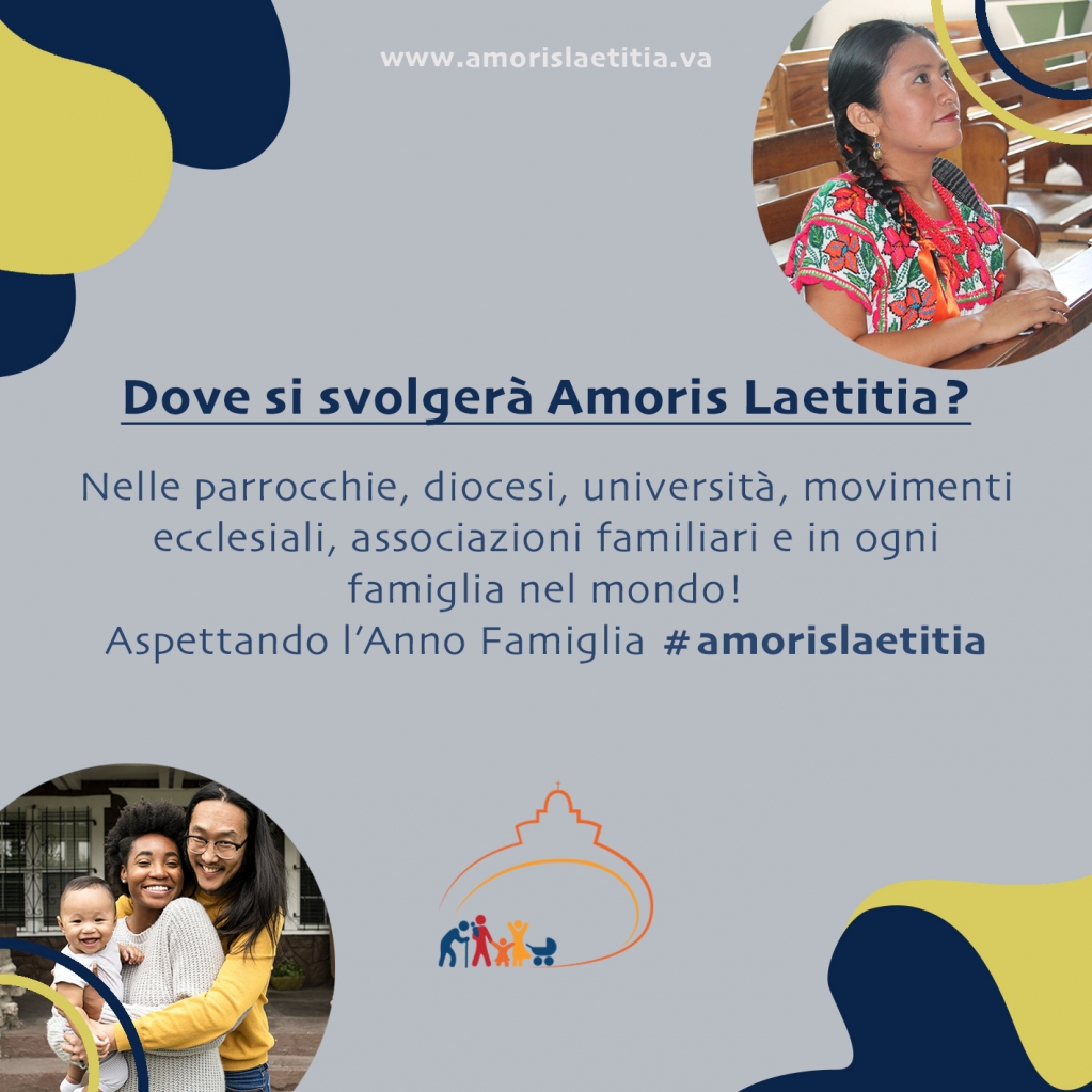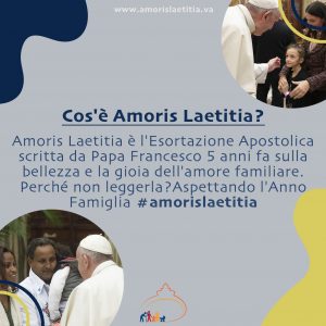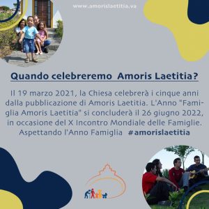 19 marzo 2021: inizio l’Anno famiglia Amoris Laetitia! Pubblicato il Marzo 18, 2021 - Archivio news, Incontro Mondiale Famiglie, Roma 2022, Sposi e famiglia Il 19 marzo, solennità di San Giuseppe, il Papa inaugura l’anno dedicato alla Esortazione apostolica “Amoris Laetitia” (pubblicata nel 2016), che si concluderà il 26 giugno 2022 in occasione del 10° Incontro mondiale delle famiglie.