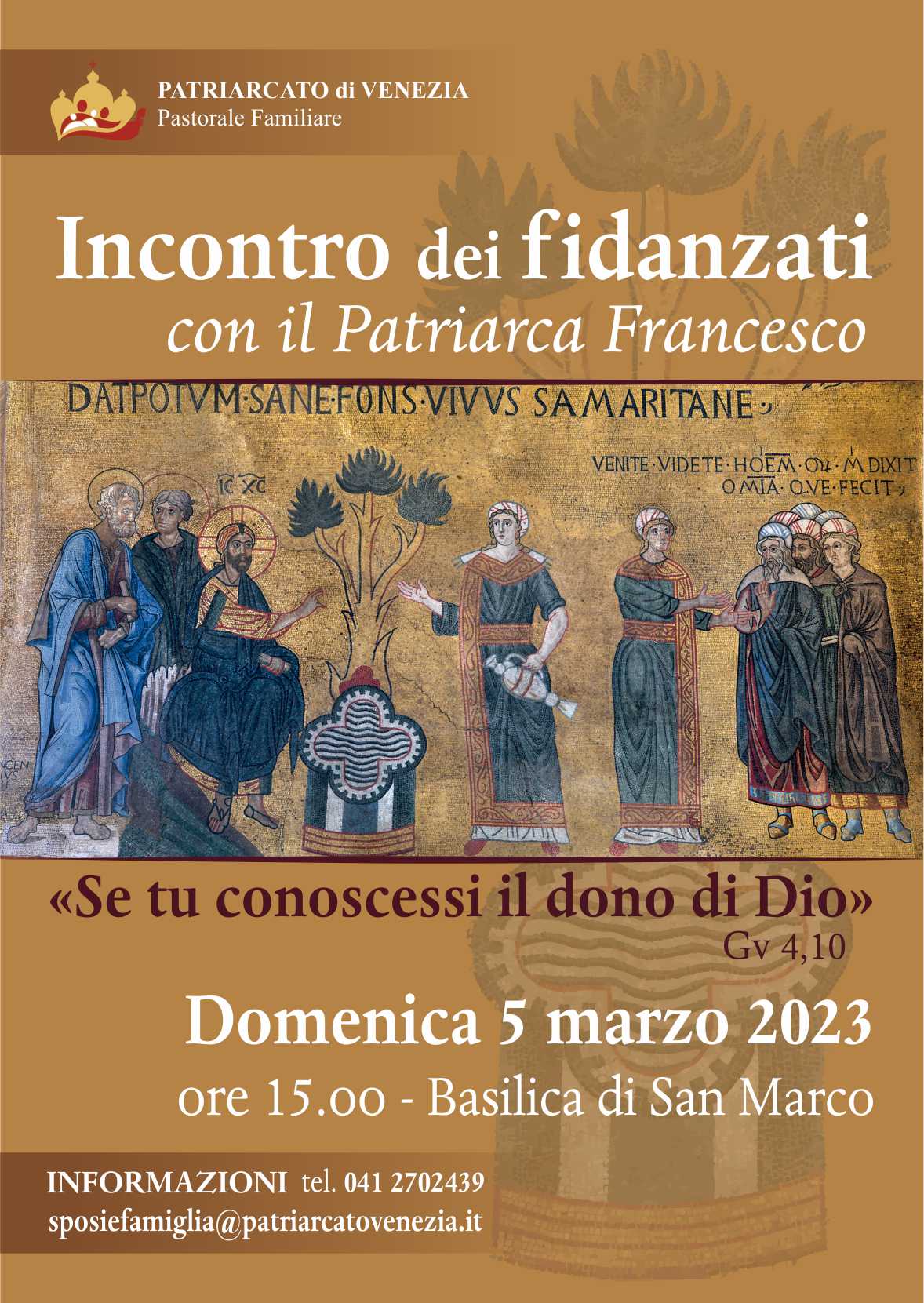 Si rinnova l’appuntamento per tutti coloro che si stanno preparando al matrimonio: il Patriarca Francesco attende tutti, fidanzati e formatori, domenica 5 marzo ore 15:00 nella Basilica di San Marco. L’icona biblica della samaritana ci aiuterà a riscoprire il primo grande dono da cui tutto parte: il nostro battesimo e l’incontro personale col Signore.
