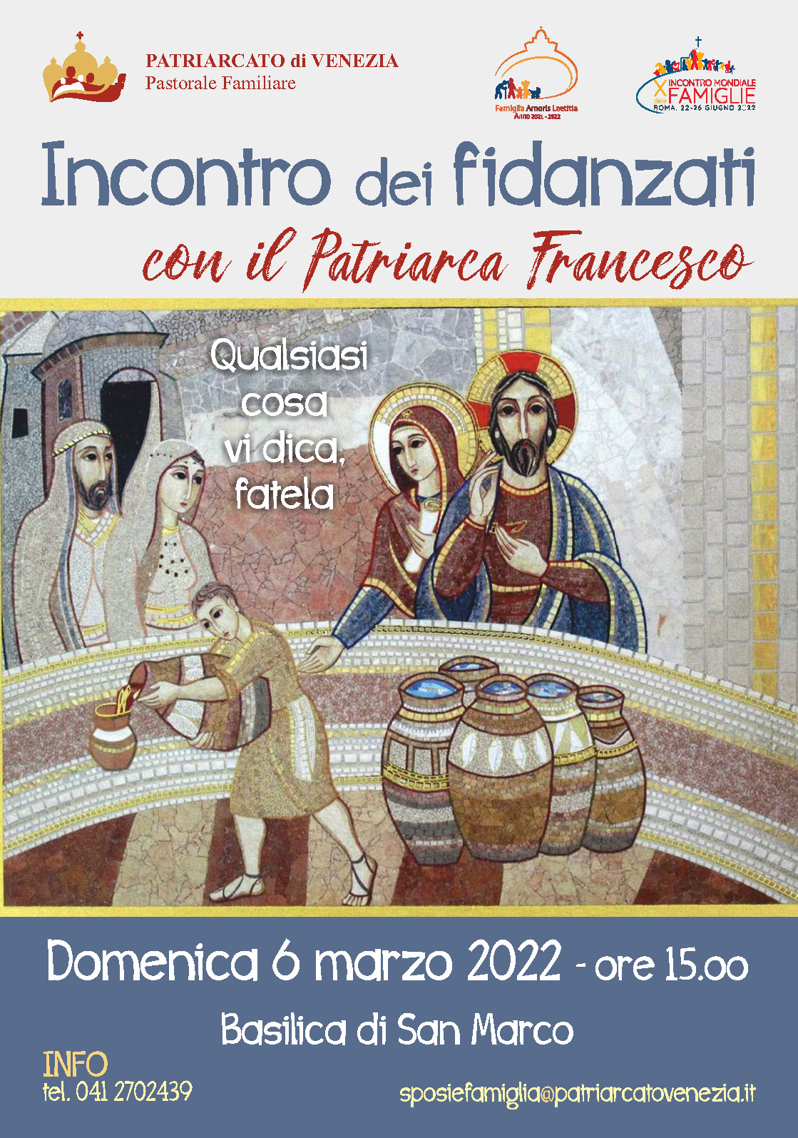 Domenica 6 marzo pomeriggio tutti i fidanzati che si preparano al matrimonio sono invitati nella Basilica di San Marco per l’incontro diocesano col Patriarca Francesco, importante appuntamento che si inserisce nell’Anno “Famiglia Amoris Laetitia” e nel cammino verso il X Incontro Mondiale delle famiglie. 😍😍😍