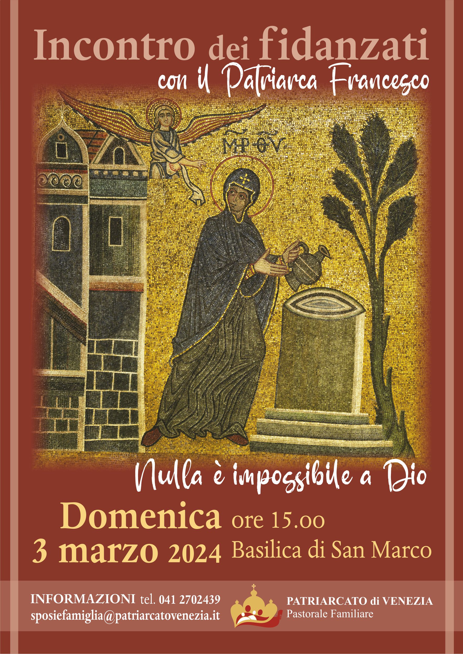 Le coppie che si preparano al matrimonio, assieme ai propri sacerdoti e alle equipe di formatori, sono invitate domenica 3 marzo alle ore 15.00 nella Basilica di San Marco per un incontro col Patriarca Francesco, occasione preziosa per riflettere sul significato del sacramento, la vita coiungale cristiana e pregare assieme il Signore.