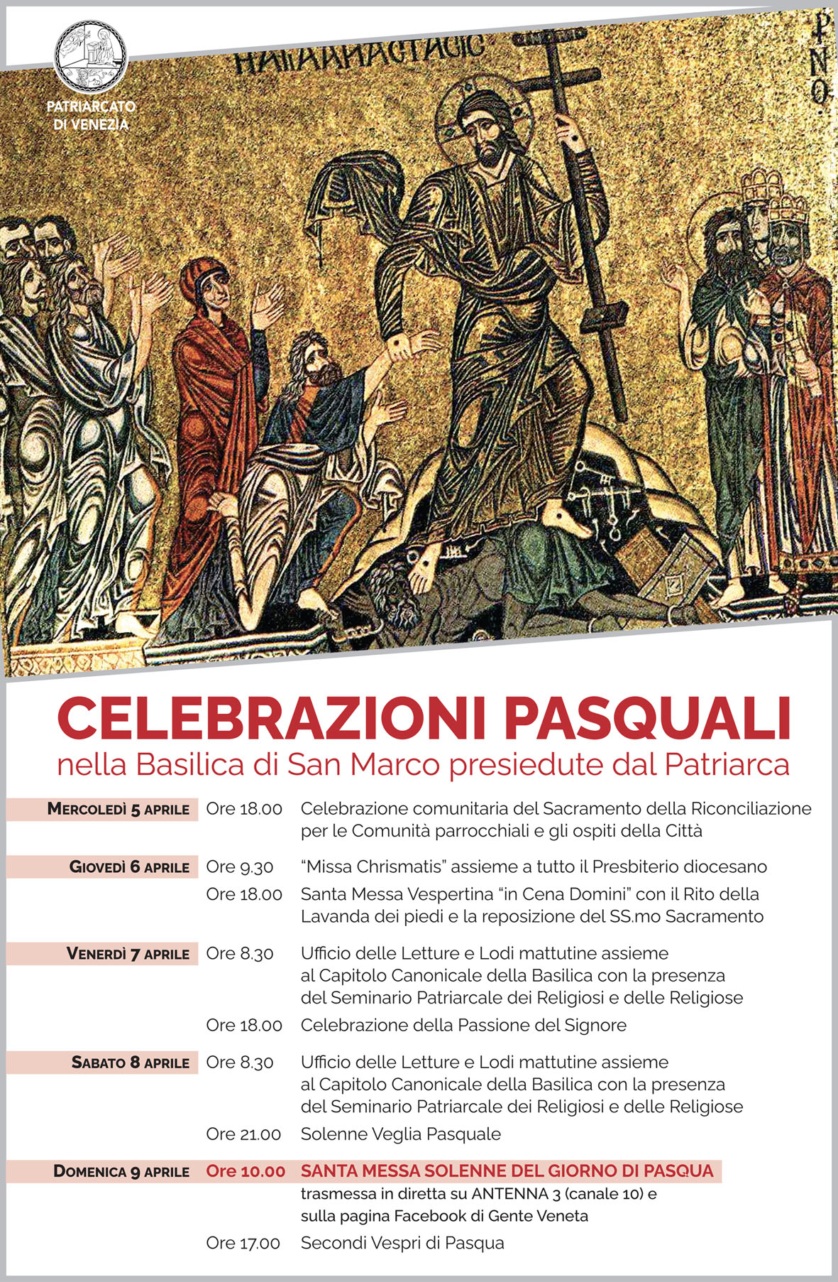 Nei files qui allegati sono riportati tutti gli orari delle celebrazioni in programma dal 2 al 10 aprile 2023 (Settimana Santa e Pasqua) nella basilica cattedrale di San Marco a Venezia ed in particolari quelli presieduti dal Patriarca Francesco Moraglia.