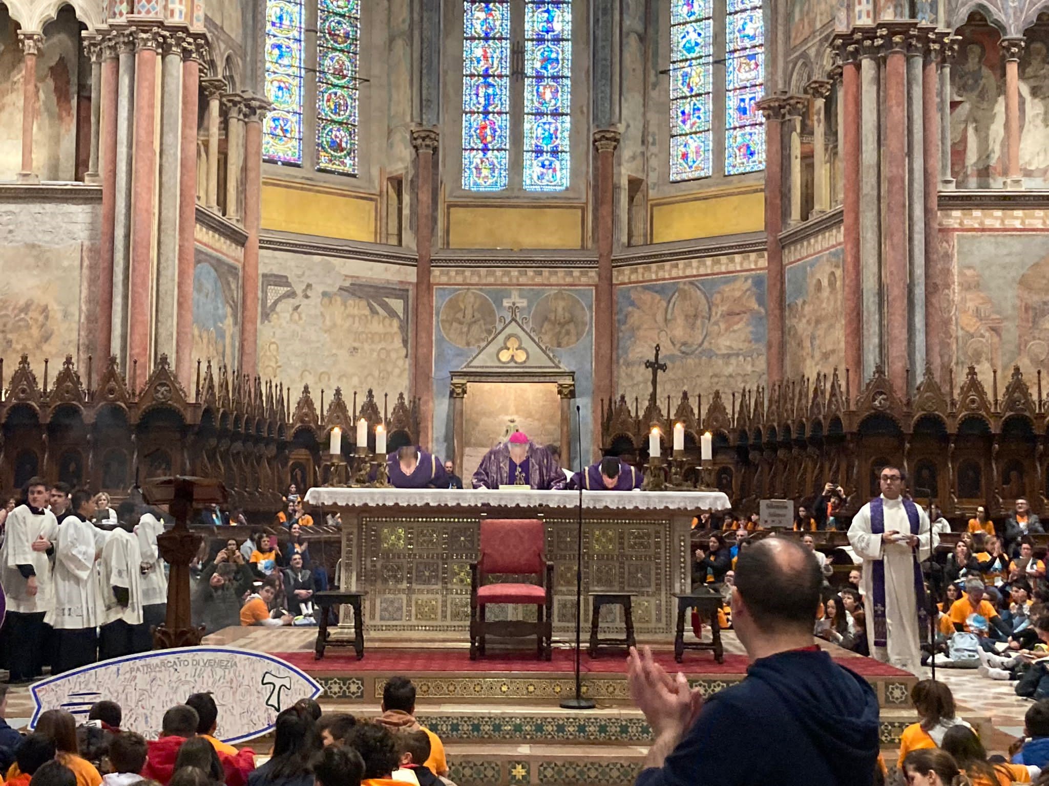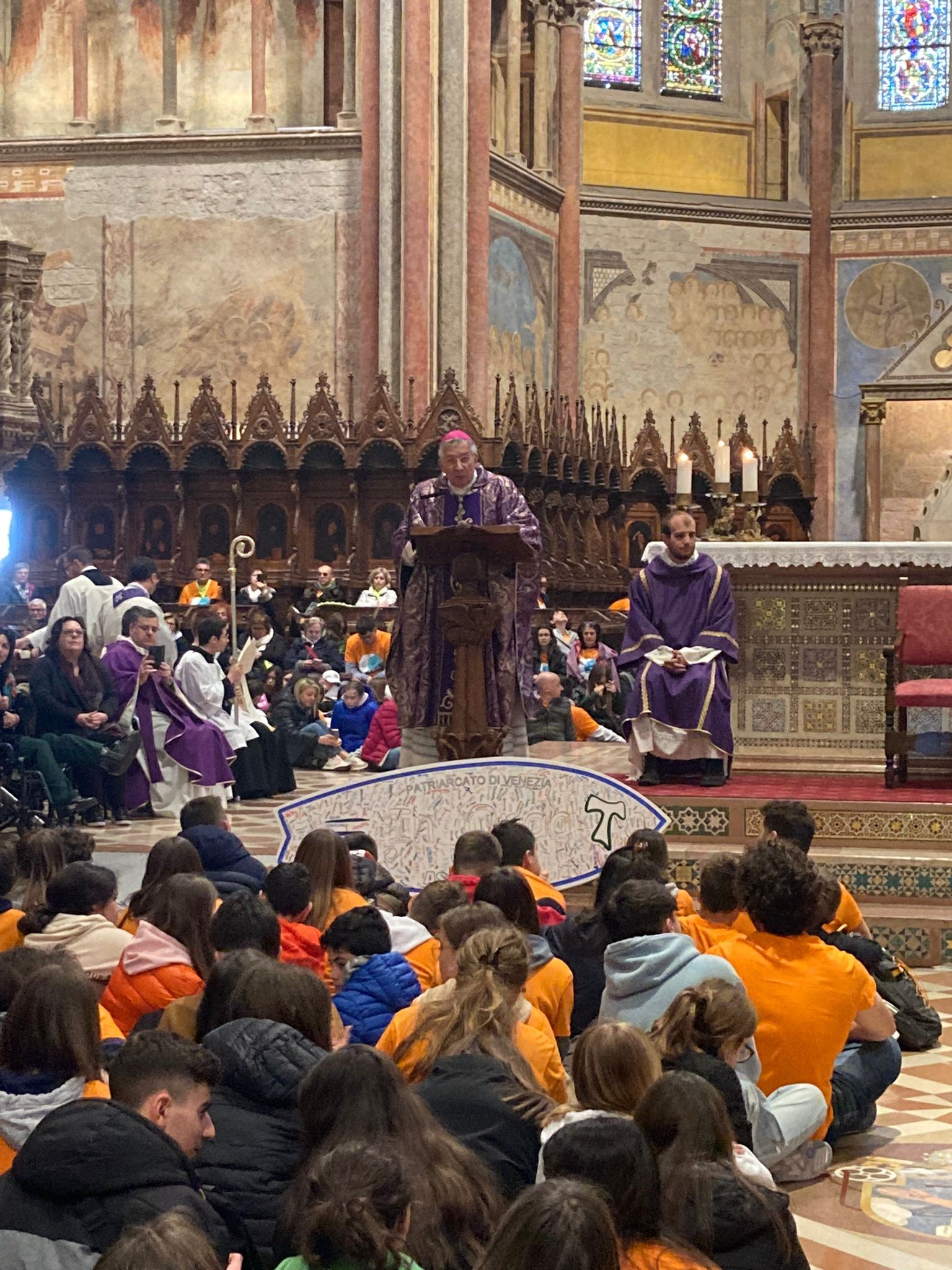 Grande celebrazione conclusiva presieduta oggi dal Patriarca per il pellegrinaggio diocesano dei ragazzi delle Medie presso la Basilica superiore di San Francesco. Con una sorpresa, il saluto e il ringraziamento al Papa per i suoi 10 anni di ministero per la Chiesa Universale.