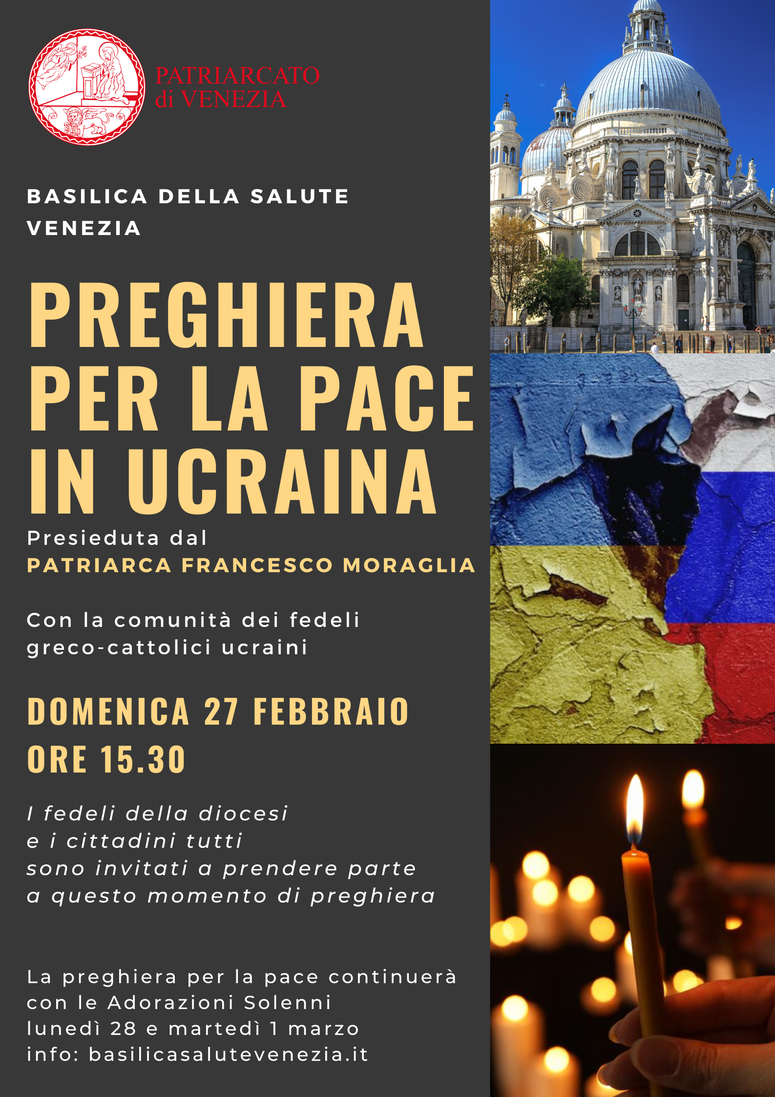 Ci apprestiamo a vivere con intensità e partecipazione il prossimo Mercoledì delle Ceneri – 2 marzo – come giornata di preghiera, di digiuno e di grande unanime invocazione per la pace in Ucraina. Intanto domenica prossima, 27 febbraio, alle ore 15.30 nella basilica della Salute si terrà un momento di preghiera, a cui tutti sono invitati, con la partecipazione dei fedeli della comunità ucraina cattolica di Venezia.