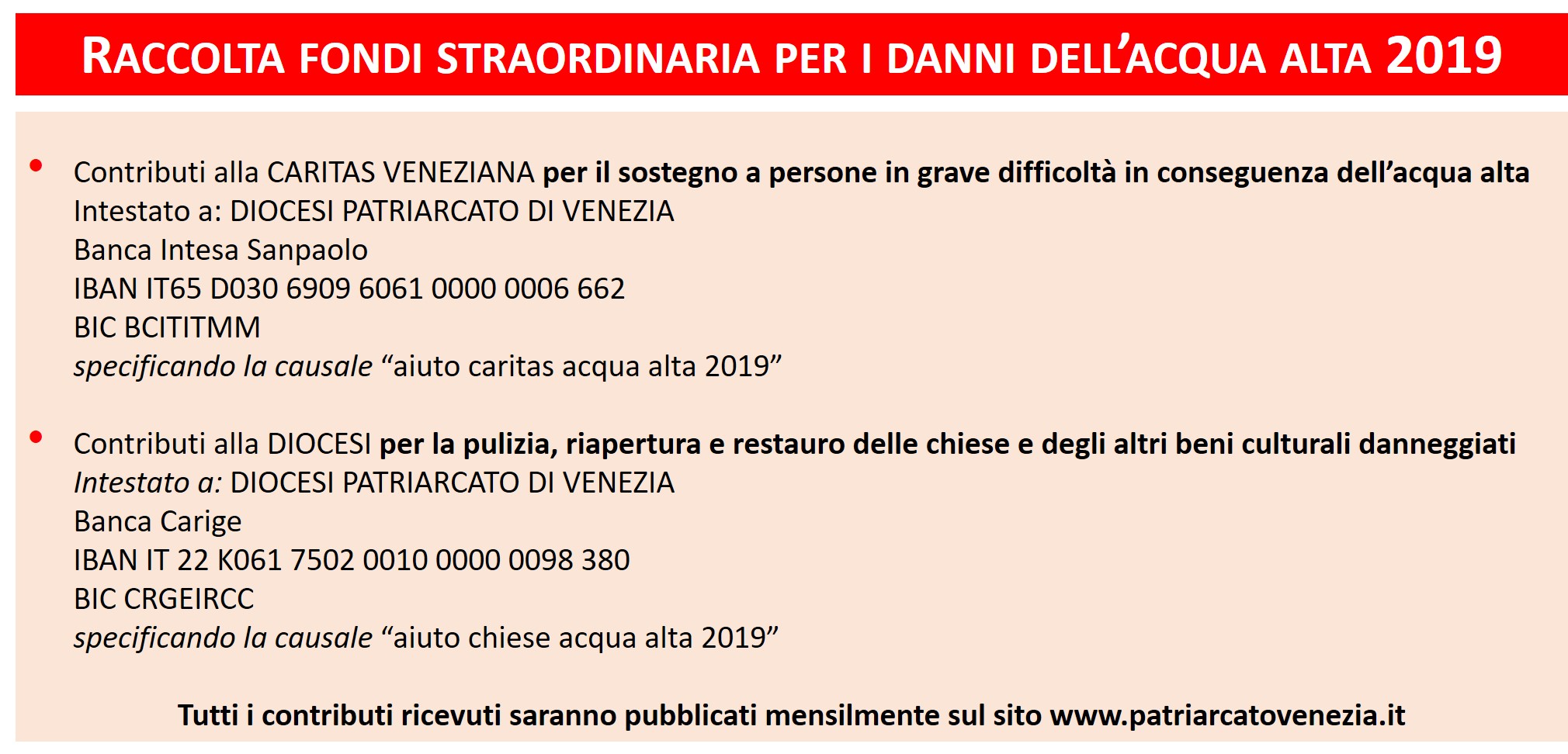 In queste ore di emergenza stanno giungendo alla Diocesi di Venezia numerose richieste da parte di donatori che desiderano contribuire economicamente per i danni causati alle persone e alle chiese dall’eccezionale acqua alta del 12 e del 15 novembre.