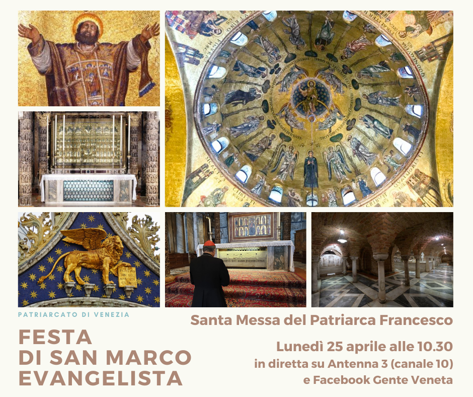 Lunedì 25 aprile 2022, solennità del Santo Evangelista Marco, patrono di Venezia, del Patriarcato e delle genti venete, il Patriarca Francesco Moraglia presiederà la Santa Messa nella basilica cattedrale metropolitana alle 10.30. La celebrazione sarà trasmessa in diretta da Gente Veneta Facebook e da Antenna 3 (canale 10).