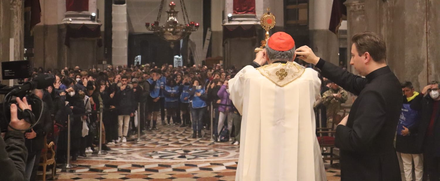 Partiti da campo San Maurizio attorno alle 18.45 i giovani hanno pregato il Rosario processionalmente giungendo alla Salute attraverso il Ponte Votivo. In Basilica hanno assistito ad una catechesi multimediale proposta dalla professoressa Ester Brunet, esperta e docente di Storia dell’Arte cristiana, e poi hanno ascoltato la meditazione del Patriarca Francesco, di cui trasmettiamo in calce il testo integrale. Al termine della celebrazione il Patriarca ha benedetto i ragazzi con una reliquia del Beato Carlo Acutis.