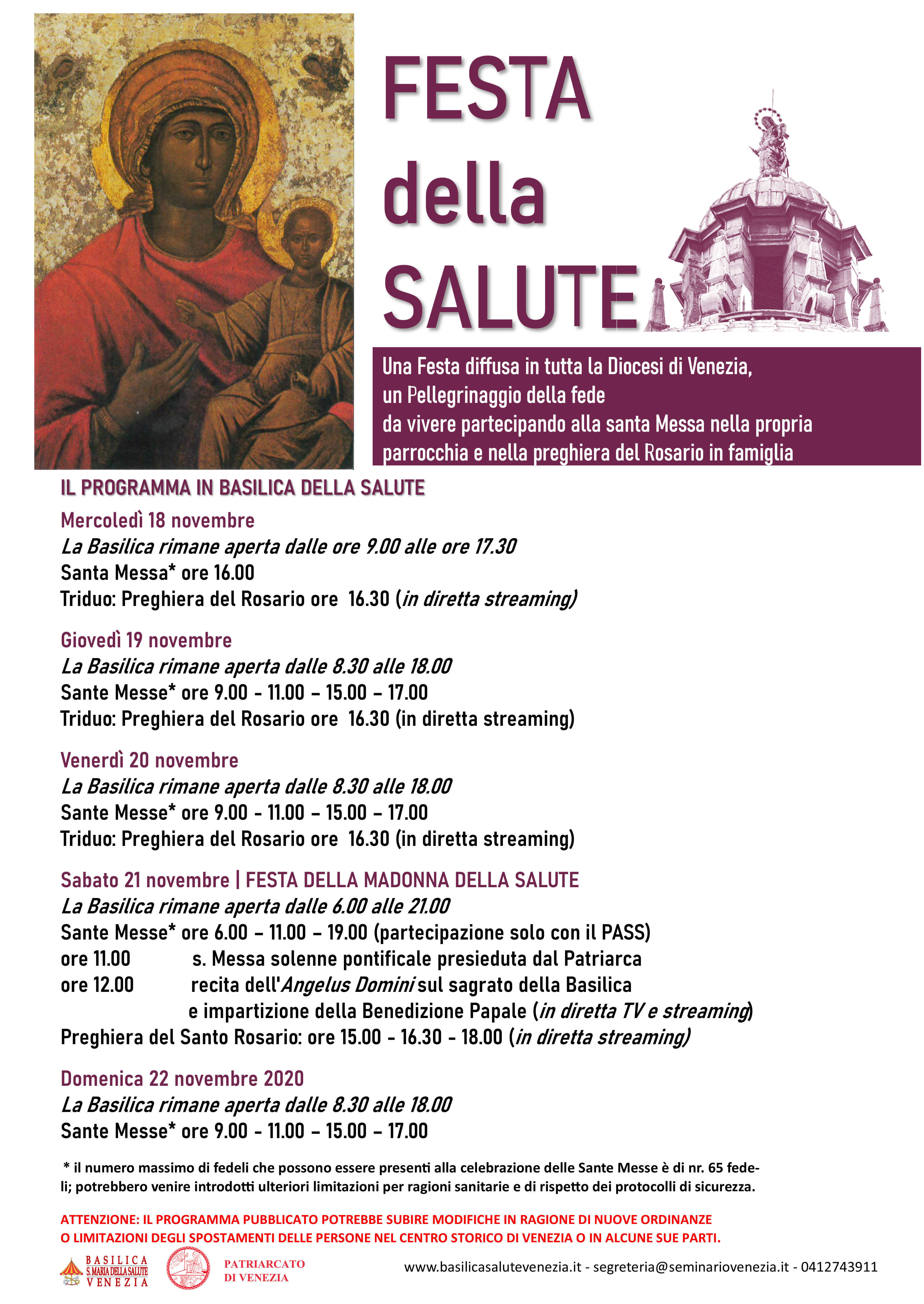 Nella più ampia collaborazione tra le diverse autorità pubbliche, il Patriarcato di Venezia e il Comune di Venezia uniscono gli sforzi affinché l’annuale festività della Salute possa essere vissuta nel pieno rispetto delle esigenze di sicurezza e di salute pubblica che devono essere considerate premesse per ogni tipo di manifestazione religiosa.