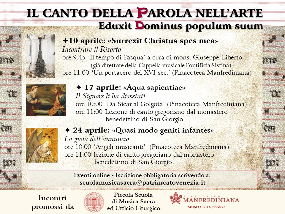 La Piccola Scuola di Musica Sacra per la Liturgia è lieta di presentare il nuovo modulo “Il canto della Parola nell’arte: Eduxit Dominus populum suum”, frutto della collaborazione con gli amici della Pinacoteca Manfrediniana (v. calendario nella locandina allegata).
