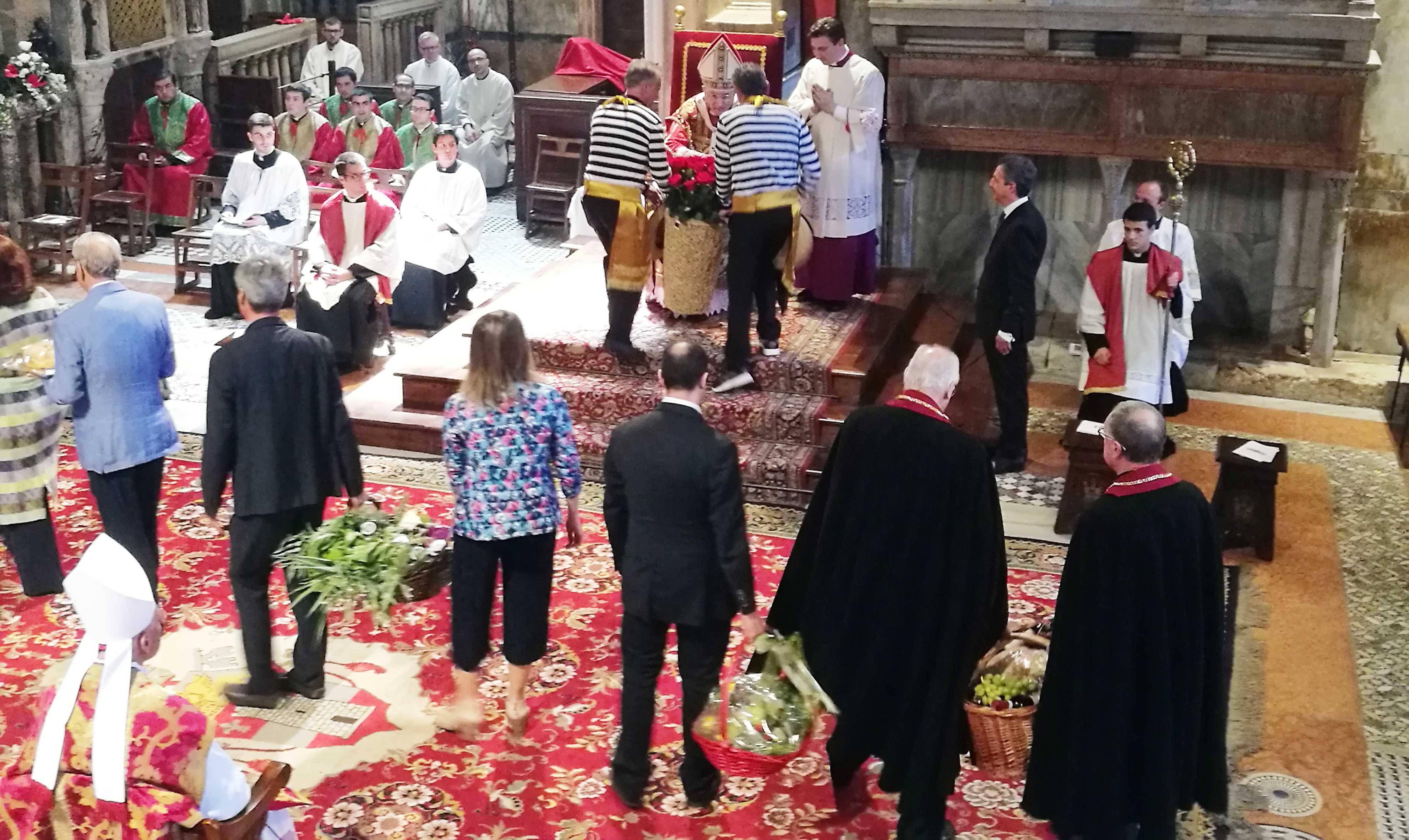 Al momento dell’offertorio, dopo i doni eucaristici del pane e del vino, sono stati portati al Patriarca anche alcuni frutti della terra e della laguna (nonché del lavoro dell’uomo): il pesce giunto da Burano, i prodotti agricoli biologici arrivati dall’isola di Sant’Erasmo, il pane offerto dai panificatori veneziani, i doni della Confraternita della vite e del vino e, infine, gli immancabili e tradizionali “bocoli” offerti dai gondolieri veneziani.