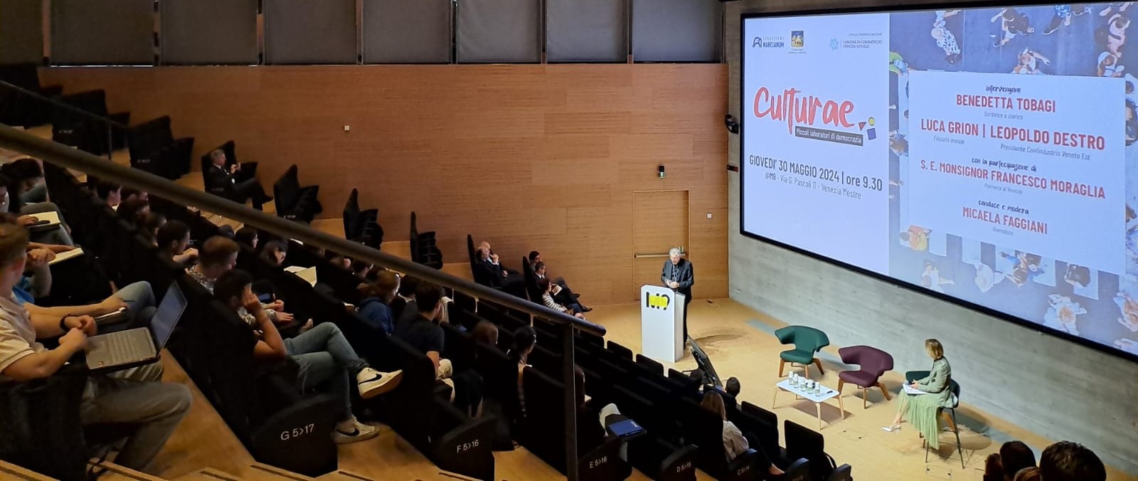 Il Patriarca Francesco è intervenuto ieri, giovedì 30 maggio, all’evento 𝐂𝐔𝐋𝐓𝐔𝐑𝐀𝐄. 𝑷𝒊𝒄𝒄𝒐𝒍𝒊 𝑳𝒂𝒃𝒐𝒓𝒂𝒕𝒐𝒓𝒊 𝒅𝒊 𝑫𝒆𝒎𝒐𝒄𝒓𝒂𝒛𝒊𝒂, dedicato alle Consulte Studentesche della Regione Veneto presso l’auditorium del complesso M9 Museum di Mestre (Venezia). Un appuntamento promosso dalla Fondazione Marcianum con il patrocinio di Regione del Veneto, Ufficio Scolastico Regionale per il Veneto e la compartecipazione della Camera di Commercio Venezia Rovigo. Nell’evento si è discusso di lavoro, intelligenza artificiale e di democrazia con Luca Grion, Leopoldo Destro e Benedetta Tobagi moderati da Micaela Faggiani, giornalista. Si è unito a questo appuntamento anche il Patriarca Francesco Moraglia, che ha proposto una relazione sul rapporto tra Europa e democrazia. Al termine del convegno è stato proposto lo spettacolo teatrale “Io sono Stato” a cura di BARABAO dell’associazione “Teatro Progetto”.
