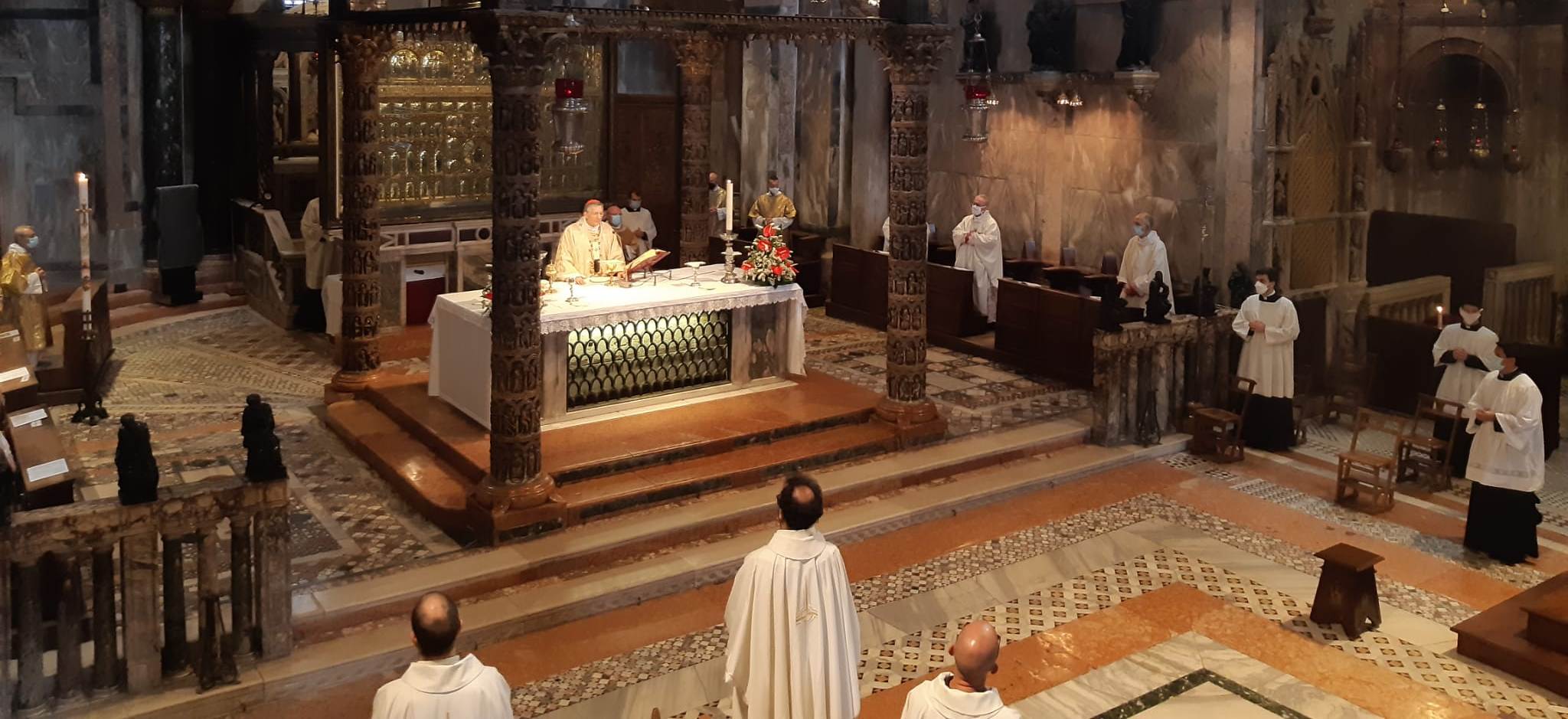 In mattinata e in forma ridotta (senza la tradizionale processione eucaristica in Piazza San Marco) , il Patriarca di Venezia Francesco Moraglia ha presieduto la S. Messa nella basilica cattedrale di S. Marco Evangelista culminata con una breve processione interna e la benedizione eucaristica all’intera città.