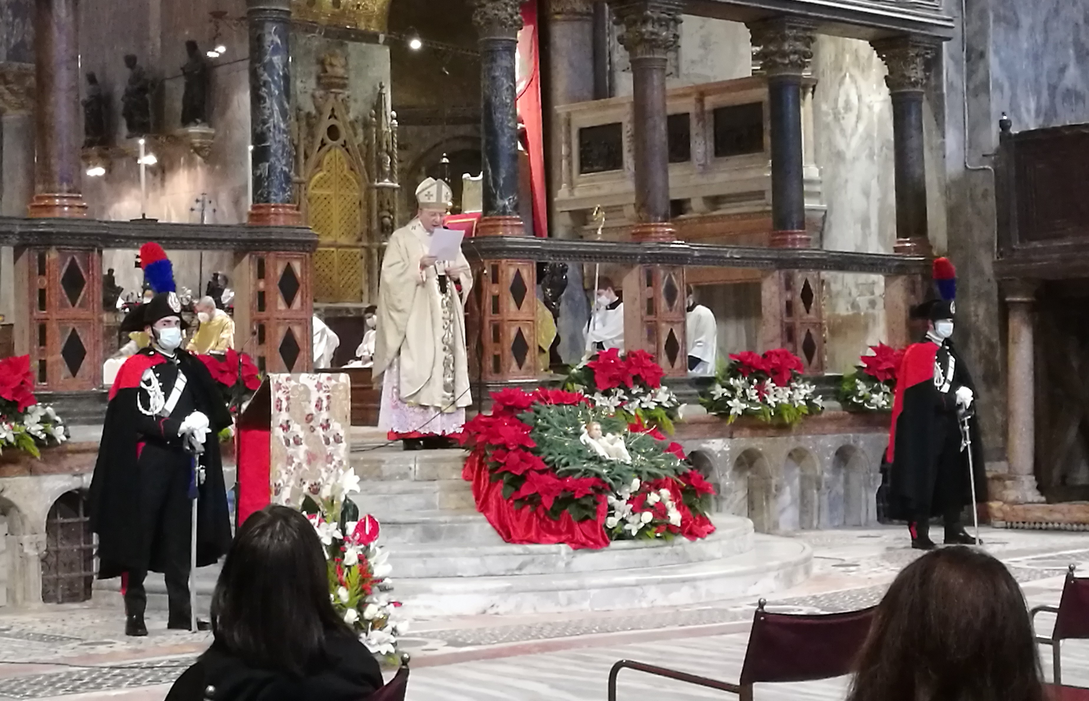 “Il protrarsi della pandemia ci porta a vivere un Natale particolare, segnato da non poche limitazioni imposte dall’autorità pubblica per il bene comune, prima fra tutte il non poter vivere pienamente, in famiglia e insieme ai nostri cari, questi giorni. E non tutti quelli che avrebbero voluto essere qui in basilica sono potuti venire… Tutto questo non ci impedisce di “fare” Natale, di lasciar risuonare nel nostro cuore e nelle nostre famiglie la bella notizia di questo giorno: “…il Verbo si fece carne e venne ad abitare in mezzo a noi” (Gv, 1,14). Dio, nel Bambino nato a Betlemme, si è manifestato come Colui che si abbassa per condividere le fatiche, le sofferenze, le fragilità, le debolezze umane”: ha iniziato così la sua omelia stamattina, nel Pontificale di Natale, il Patriarca di Venezia Francesco Moraglia (testo integrale riportato in calce).