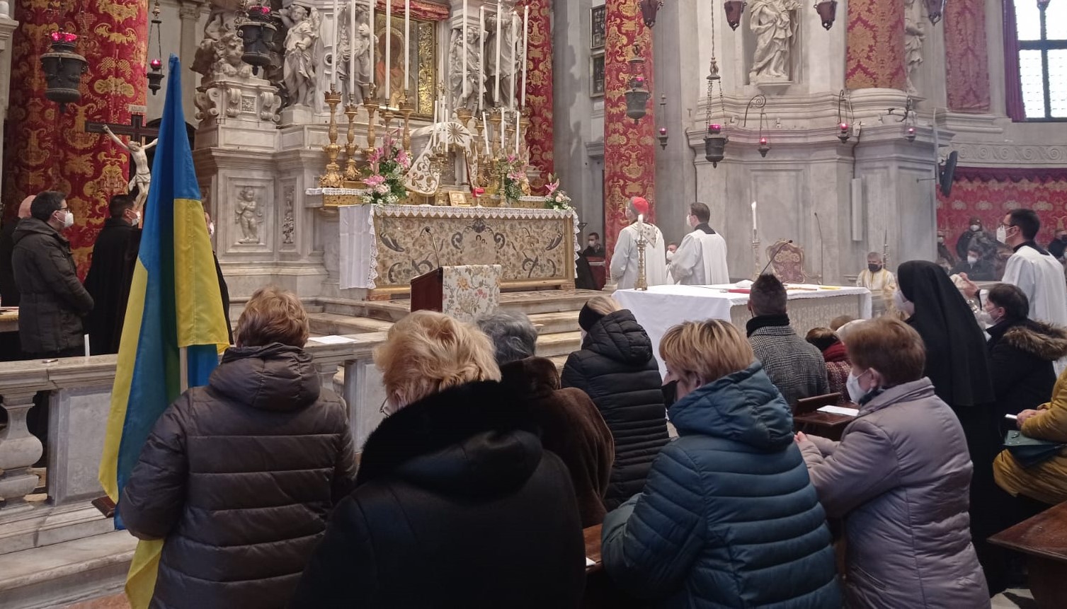 Oggi pomeriggio, alle 15.30, presso la basilica della Madonna della Salute, si è svolta la preghiera per la pace in Ucraina, presieduta dal Patriarca di Venezia Francesco Moraglia. Insieme ai fedeli greco-cattolici ucraini, accompagnati dal loro cappellano padre Yaroslav Chaykivskyy, i fedeli del Patriarcato hanno pregato il Santo Rosario. Le decine dell’Ave Maria che compongono la corona sono state pregate alternando italiano ed ucraino. Nel corso della celebrazione sono stati meditati alcuni brani del magistero dei recenti Pontefici, in particolar modo Papa Francesco. L’appuntamento di preghiera è stato preceduto dalla celebrazione della Divina Liturgia.