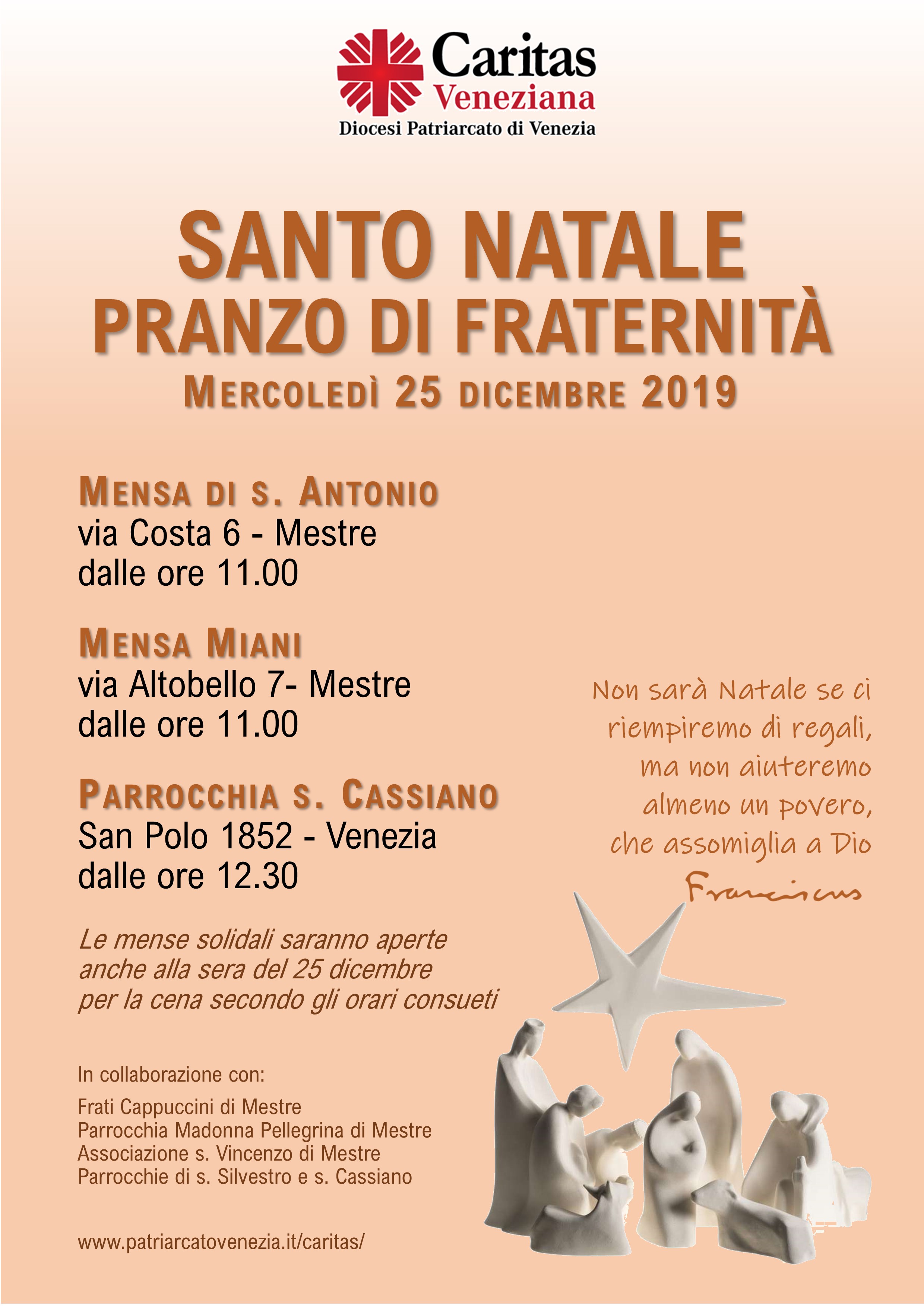 Se il Patriarca parteciperà al pranzo di Natale nel centro storico della città lagunare, nell’intento di continuare a mantenere un segno di attenzione su Venezia ( città-emblema di fragilità per l’emergenza acqua alta di queste settimane), non mancheranno nella terraferma mestrina le opportunità di reale vicinanza e solidarietà con le persone più bisognose. Anche nella giornata di Natale, infatti, a Mestre i pasti per le persone povere, in difficoltà e senza fissa dimora saranno garantiti in ben tre luoghi che rimangono aperti e attivi: la mensa dei Cappuccini, la mensa dei Padri Somaschi a pranzo, la mensa di Ca’ Letizia alla sera. A Marghera, inoltre, sarà regolarmente attiva la mensa “Papa Francesco”.