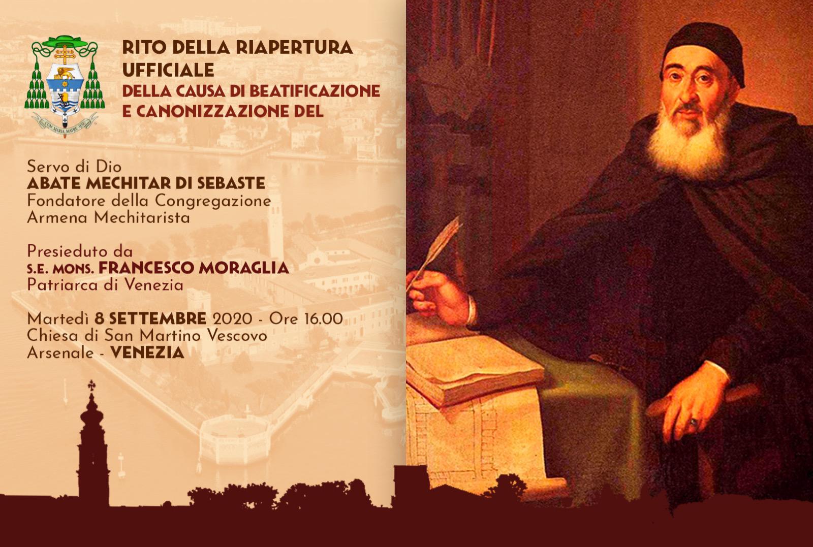 Si è riaperta martedì 8 settembre, con un rito svoltosi a Venezia, la causa per la beatificazione e la canonizzazione del Servo di Dio Abate Mechitar di Sebaste, fondatore della congregazione armena mechitarista. Il rito si è tenuto  nella chiesa di San Martino di Castello, alle ore 16, ed è stato presieduto dal Patriarca Francesco. Durante la cerimonia si è tenuto anche il giuramento degli ufficiali di causa, tra cui il Patriarca stesso, don Benedict Ejeh, Preside della Facoltà di Diritto canonico, e don Pierpaolo Dal Corso, notaio di Curia e docente presso la Facoltà di Diritto canonico.