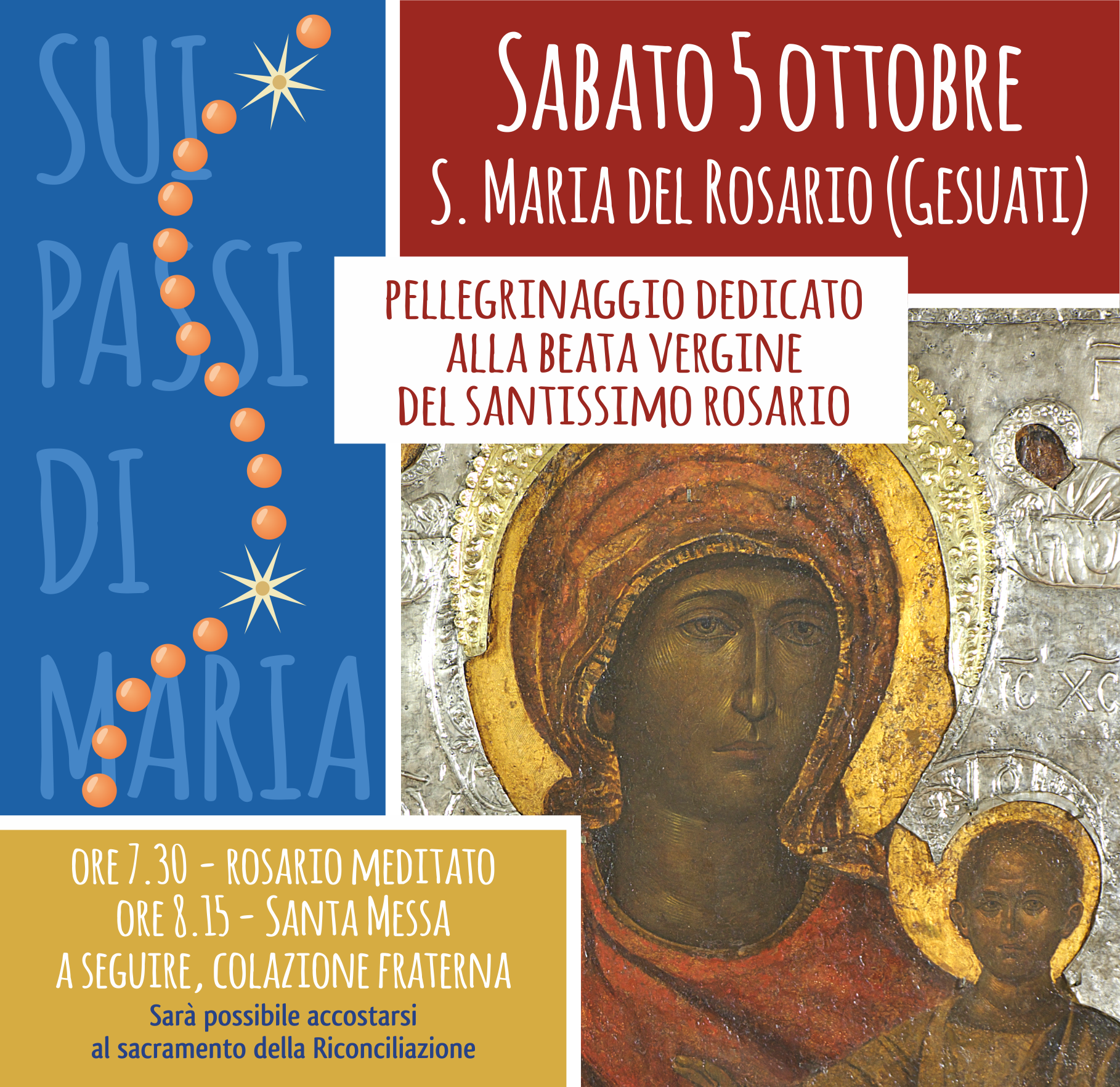 Il ritrovo per il primo pellegrinnaggio dell’anno sarà – secondo le modalità già sperimentate in questi anni – alle ore 7.30 di sabato 5 ottobre per compiere il percorso previsto tra le due grandi chiese veneziane del sestiere di Dorsoduro, entrambe intitolate alla Madonna; si parte appunto dalla chiesa parrocchiale di S. Maria del Rosario (detta “dei Gesuati”) alle Zattere e da lì, recitando la preghiera del Rosario, ci si dirigerà verso la basilica della Salute dove, intorno alle ore 8.15, si terrà la S. Messa presieduta dal Patriarca; al termine, quindi, un momento di fraternità per tutti con la colazione consumata insieme. Nel corso del pellegrinaggio, inoltre, sarà possibile accostarsi al sacramento della riconciliazione. A seguire, alle ore 10.30, il Patriarca terrà la sua prolusione d’inizio anno nell’ambito della Scuola diocesana di Teologia nella zona di Venezia centro storico e isole.