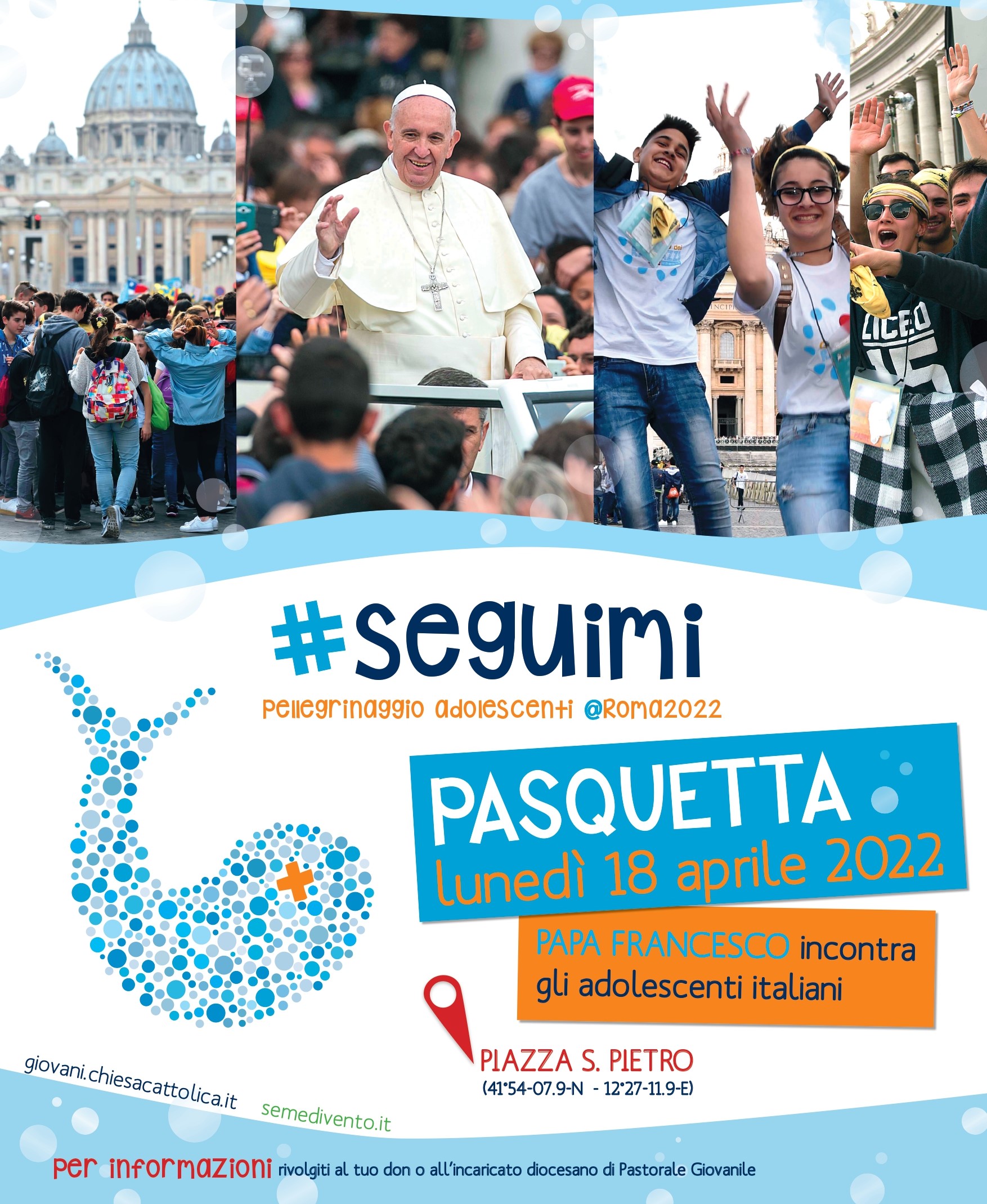 Nel pomeriggio di lunedì, in piazza San Pietro, l’animazione stile Gmg – con canti, musica, preghiera e testimonianze – inizierà alle 16. L’arrivo del Papa è previsto attorno alle 17.30 e l’incontro dovrebbe concludersi attorno alle ore 20.