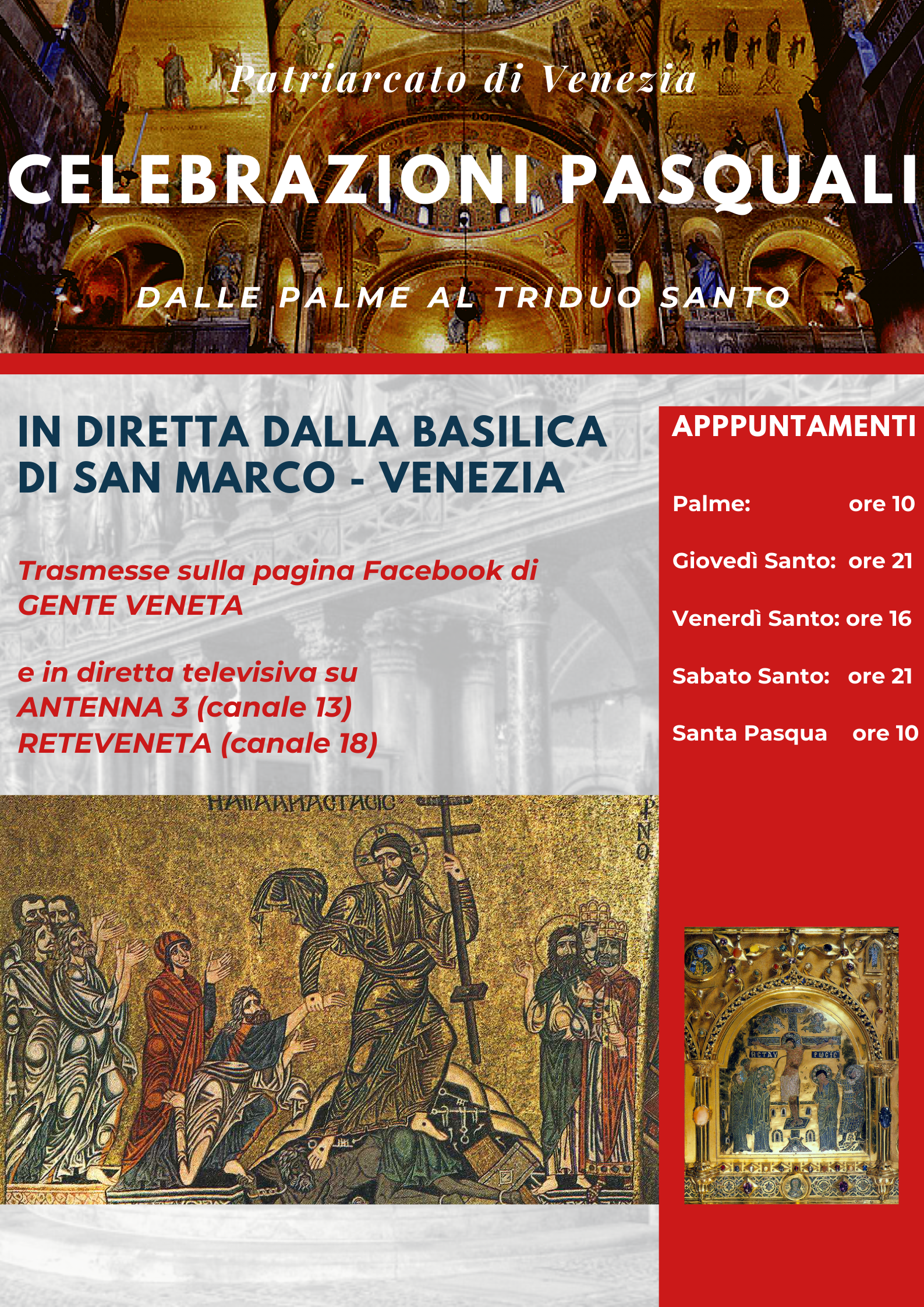 Tutte le azioni liturgiche saranno trasmesse in diretta streaming dalla pagina Facebook di Gente Veneta e in diretta televisiva su Antenna 3 (canale 13) e Reteveneta (canale 18).