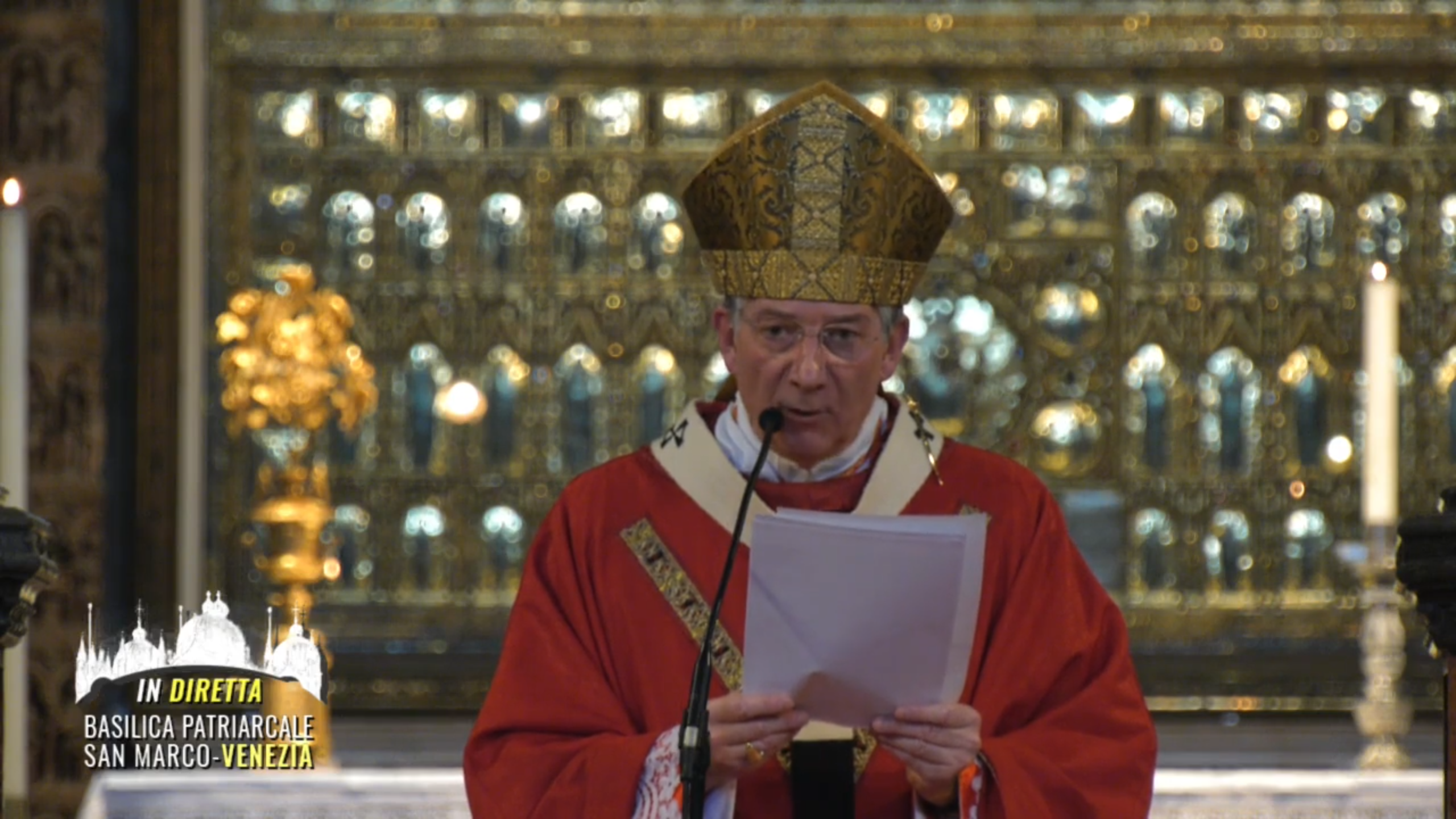 San Marco, il protettore delle Genti Venete, il nostro Patrono, il Patrono a cui è dedicata questa Basilica oggi deserta, il Patrono di un popolo oggi assente, ma presente spiritualmente attraverso voi che ci seguite da casa, ci aiuti a fare qualcosa perché il nostro tempo porti il segno di chi ha voluto ricostruire. San Marco Evangelista, prega per noi!