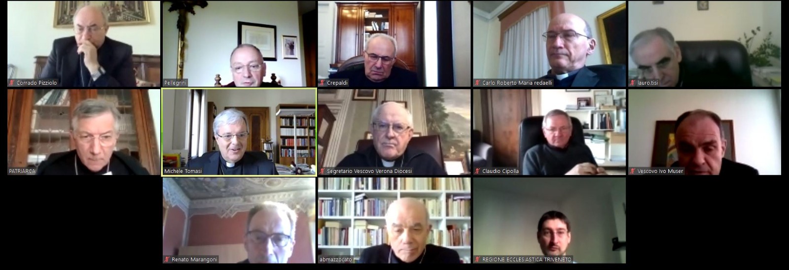 Nuovo appuntamento in videoconferenza, nella mattinata di oggi, per i Vescovi della Conferenza Episcopale Triveneto che, collegati dalle rispettive sedi (v. foto in allegato), si sono a lungo confrontati soprattutto in vista delle prossime celebrazioni della Settimana Santa e della Pasqua secondo le modalità consentite e rese necessarie dall’attuale emergenza coronavirus.